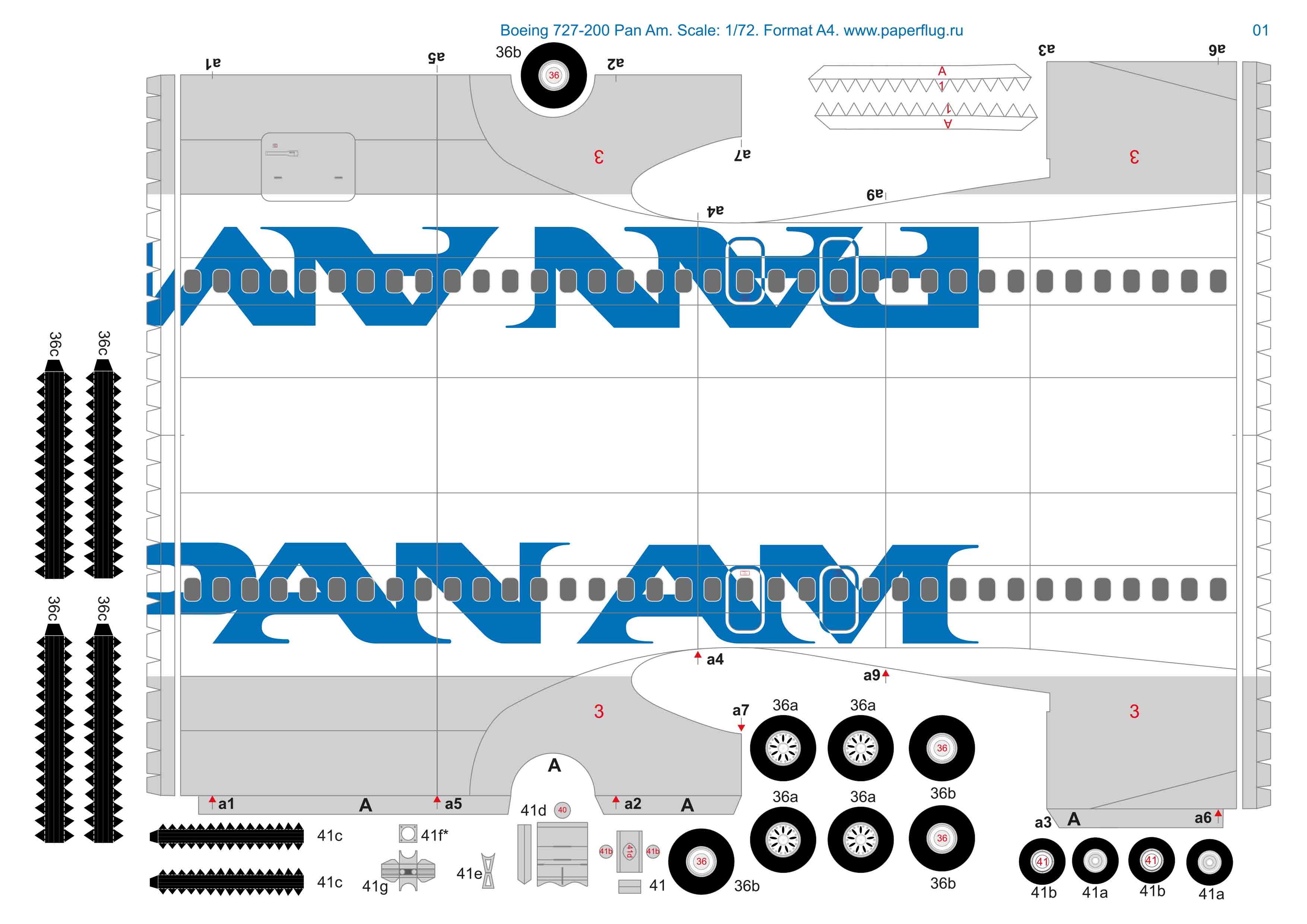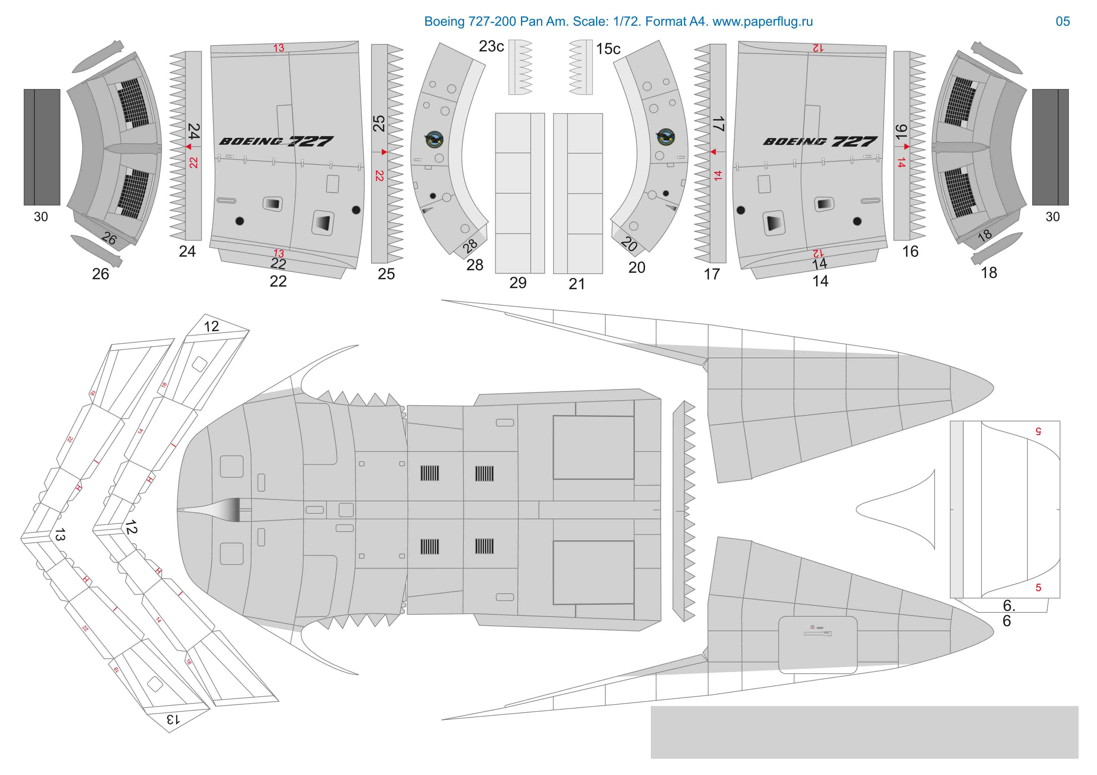 Скачать pdf файл с развертками и инструкцией бумажной модели Boeing 727-200 в ливрее Pan Am в масштабе 1:72 можно в разделе Ссылки.